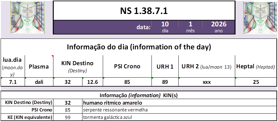Estamos no anel NS 1.38 do(a) semente ressonante amarela, Tzolkin 54 do(a) mago lunar branco, 7. lua, lua ressonante do macaco, heptal 25 vermelho, o conhecimento inicia a visão.