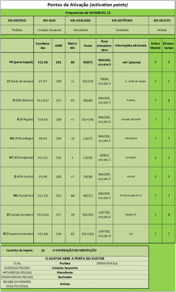 AN (KIN análogo), V. 8, H. 5. UMB 294. (-21) Vigésima-Primeira magnitude do fluxo do espaço externo sublima o hiperplasma Alfa-Alfa da Criação Cósmica (na 1ª dimensão do tempo exterior). Campo de força do samadhi profundo (1D) sublimado pelo campo de força (7D) do Perceptor Holomental radializado radiosonicamente: Comando Cósmico Descendente. Corresponde ao Hierofante (Enlaçador de Mundos): Primeira Fonte de Poder de Hunab Ku 21 na Corte do Avatar (UMB 291). Ativado pela carga térmica ascendente Dum Kuali (UMB 405) “calor primario”. A morte é a fonte do conhecimento. Marte Galáctico-Kármico.