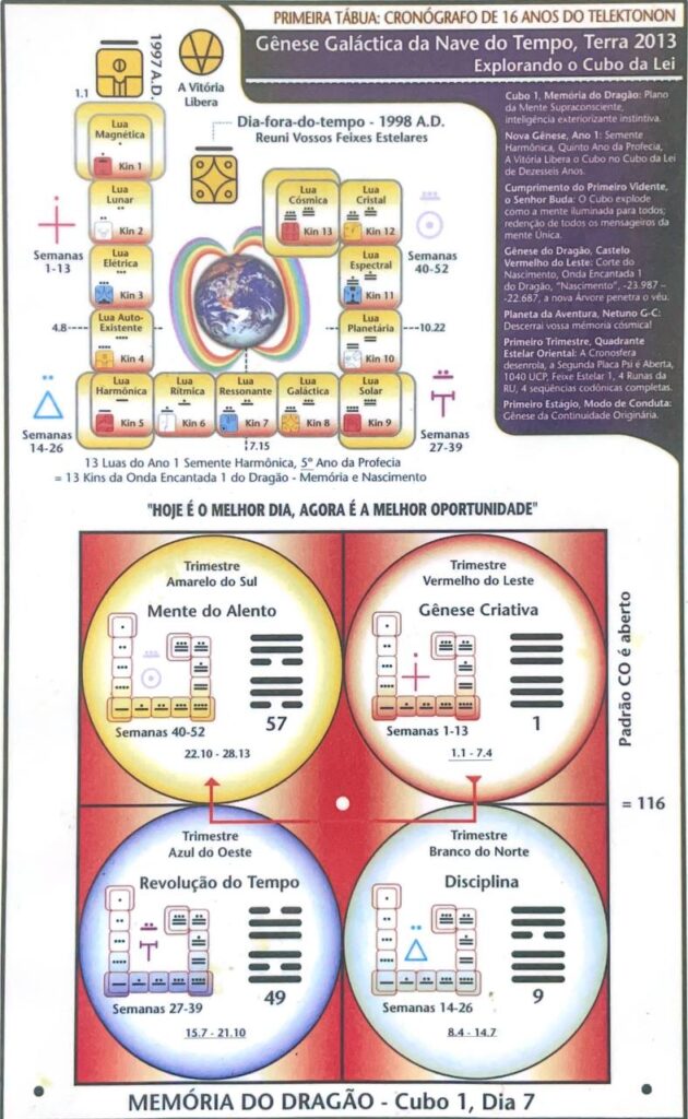 A Matriz do Tempo, V.7, H.7. UMB 377. (6) Sexta magnitude do circuito PES 6º Dimensional neutraliza a comunicação subliminal no campo de força Alfa-Alfa do samadhi profundo. O samadhi profundo neutraliza a primeira esfera mental: pré-consciente. A sexta magnitude contem as coordenadas internas da rede PES 6º Dimensional do tempo exterior do canal Alfa-Alfa. Sétima porta da terceira diagonal de Unidade.