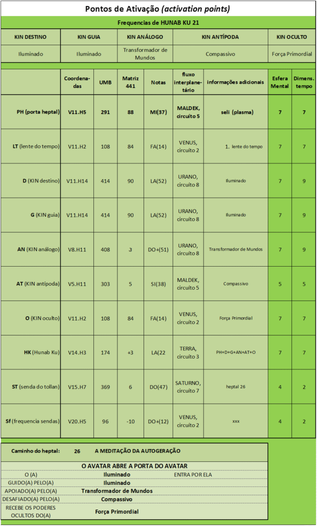 O (KIN oculto), V. 11, H. 2. UMB 108. Runa Harmônica UR 84: O Todo da Vida Galáctica Torna-se Meio de Transmisão. 3ª Oitava: Oitava do Todo de Vida Galáctica. Runa da Fila 11. Segunda porta de Unidade do tempo vertical descendente. Corresponde a Força Primordial (Dragão): Primeira Porta de luz de Hunab Ku 21. Abre a Porta da luz Universal da Corte do Avatar (UMB 291) onde está armazenado o conhecimento cósmico. A Força Primordial a partir do Polo Norte (Marka) como Ser Cósmico, evoluindo para todas as formas de direções e Manifestações. Gera o hiperplasma Alfa-Alfa estimulando o samadhi profundo e sela o plasma radial Dali. Abre a Primeira porta do heptal: Porta do Trono. Neptuno Galáctico-Kármico.