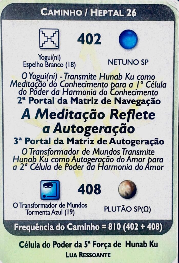 O Kin Analógo, V. 11, H. 8. UMB 402. Runa Harmônica UR 81: A Radiogenesis Estabelece o Todo da Vida Galáctica. 3ª Oitava: Oitava do Todo da Vida Galáctica. Runa da Fila 11. Oitava porta de Unidade do tempo vertical descendente. Corresponde ao Yogue/ni (Espelho). Segundo Porta da Matriz de Hunab Ku 21. Yogue/ni mede a força da luz-fotón-ciclón de Hunab Ku com a linha de força centrífuga térmica Dum Kuali e a linha de força centrípeta térmica-lumínica Kum. A partir daqui é gerado o Hiperneutron que estimula os estados subliminais da consciência. Ativa a célula harmônica polar norte do polo Marka com o electron mental e sela o plasma radial: Limi. Abre a sexta porta do heptal: a porta da Transcêndencia. Neptuno Solar-Profético.