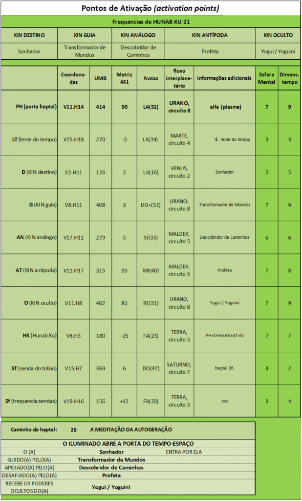 O (KIN oculto), V. 11, H. 8. UMB 402. Runa Harmônica UR 81: A Radiogenesis Estabelece o Todo da Vida Galáctica. 3ª Oitava: Oitava do Todo da Vida Galáctica. Runa da Fila 11. Oitava porta de Unidade do tempo vertical descendente. Corresponde ao Yogue/ni (Espelho). Segundo Porta da Matriz de Hunab Ku 21. Yogue/ni mede a força da luz-fotón-ciclón de Hunab Ku com a linha de força centrífuga térmica Dum Kuali e a linha de força centrípeta térmica-lumínica Kum. A partir daqui é gerado o Hiperneutron que estimula os estados subliminais da consciência. Ativa a célula harmônica polar norte do polo Marka com o eletron mental e sela o plasma radial: Limi. Abre a sexta porta do heptal: a porta da Transcêndencia. Neptuno Solar-Profético.