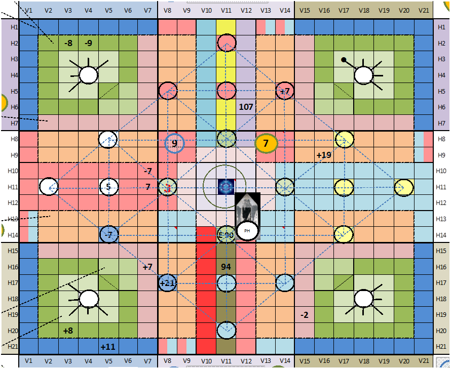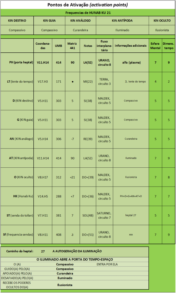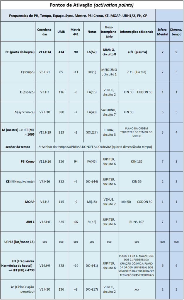 T (tempo), V.5, H.21. UMB 65. (+11) Décima primeira magnitude Ativa a Liberação Espectral do fluxo do tempo externo da Sincronização Cósmica. Corresponde-se com a 11ª h e 11ª v que coordena a matriz do PHM.
