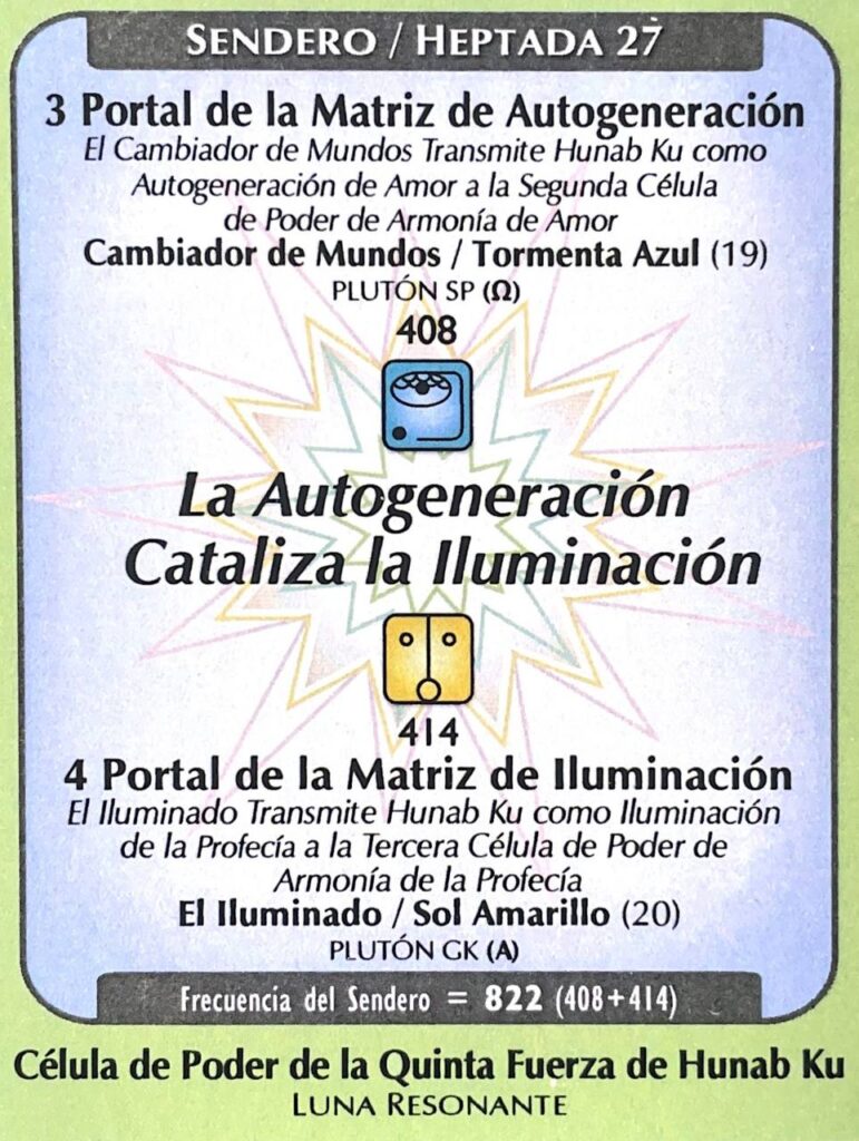 Sf (frequencia sendas), V. 8, H. 11. UMB 408. Unidade transformadora. Cataliza o campo de força térmico Kuali vermelho transformando o calor primario e a luz primaria dentro do Núcleo do Tempo Interior imprimindo a 7ª esfera mental (Perceptor Holomental) e ativando a quinta esfera mental (superconsciente). Oitava porta de Unidade do tempo radial direito. Corresponde ao Transformador de Mundos (Tormenta): Terceira Porta da Matriz de Hunab Ku 21(linha de força térmica centrífuga). Une Hunab Ku com a Corte do Compassivo. A auto-geração é a realização da Consciência Cósmica do amor. A partir daqui é gerada a linha de força térmica que estimula os estados superconscientes da mente e ativam a ordem harmônica do campo de força centrífugo do amor. O portal da Tormenta mede o campo de força de Hunab Ku para ascender às cargas elétricas de Dum Kuali e Dum Duar. Plutão Solar-Profético.