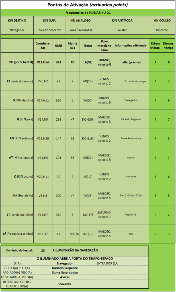 D (KIN destino), V. 14, H. 11. UMB 396. Unidade transformadora. Cataliza o campo de força lumínico Duar azul transformando a luz do calor interior (Kemio) e o calor da luz interior (Kum) dentro do Núcleo do Tempo Interior imprimindo a 7ª esfera mental (Perceptor Holomental) e ativando a sexta esfera mental (consciente subliminar). Oitava porta de Unidade do tempo radial esquerda. Corresponde ao Navegador (Terra): Primeira Porta da Matriz de Hunab Ku 21(linha de força lumínica centrípeta). Une Hunab Ku com a Corte da Inteligência. A navegação é a realização da Consciência Cósmica da inteligência. A partir daqui é gerada a linha de força lumínica que estimula os estados subliminares da consciência da mente e ativam a ordem harmônica do campo de força centrípeta da inteligência. O portal do Navegador mede o campo de força de Hunab Ku para ascender às cargas elétricas de Kum e Kemio. Urano Solar-Profético.