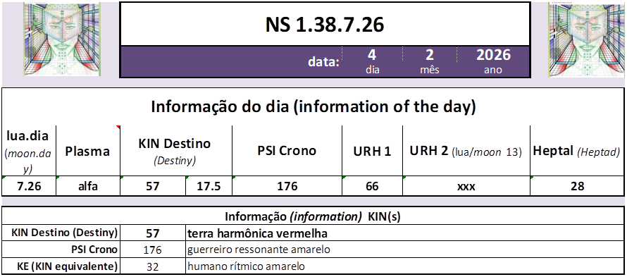 Hoje é NS 1.38.7.26, KIN 57, terra harmônica vermelha, 5. KIN da onda encantada do(a) caminhante do céu, 5. onda do Tzolkin, 1. onda do castelo branco, castelo 2 do Tzolkin.