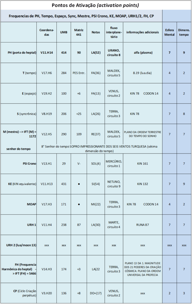 FH (Frequencia Harmônica do heptal) –> IFT (FH) = 5466, V. 14, H. 3. UMB 174. (+3) Terceira magnitude do fluxo do espaço externo. Ativa o hiperplasma Beta-Alfa da Ascensão Cósmica (na 2ª dimensão do tempo exterior). Campo de força do controle da mente superior (2D) ativado pelo campo de força (7D) do Perceptor Holomental radializado radiosonicamente: Comando Cósmico Descendente.