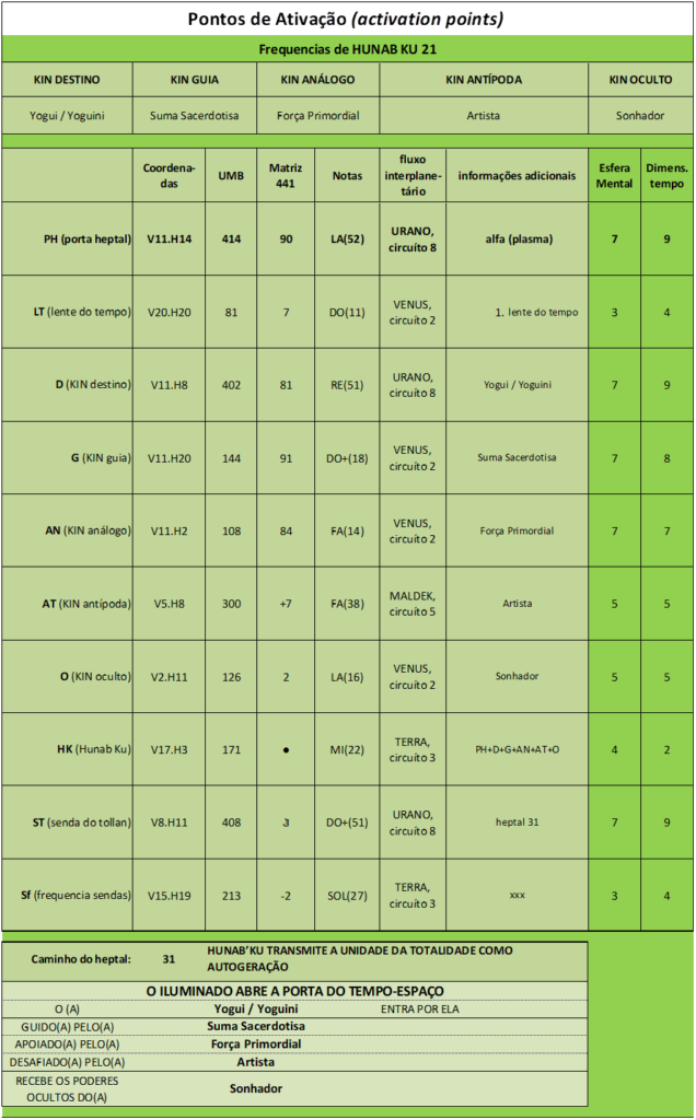 G (KIN guia), V. 11, H. 20. UMB 144. Runa Harmônica UR 91: O Todo da Arte Galáctica Define o Espaço. 4ª Oitava: Oitava do Todo da Arte Galáctica. Runa da Fila 12. Segunda porta de Unidade do tempo vertical ascendente. Corresponde a Suma Sacerdotisa (Vento): Segunda Porta de luz de Hunab Ku 21. Abre a Porta da luz Universal da Corte do Profeta (UMB 315) onde é armazenada a profecía cósmica. A Suma Sacerdotisa ascende ao Polo Sul (Darka) como Alento Cósmico e ascende como profecía. Gera o hiperplasma Beta-Beta estimulando a mediunidade do consciente desperto e sela o plasma radial Gama. Abre a Terceira porta do heptal: A Porta do Misterio. Urano Solar-Profético.