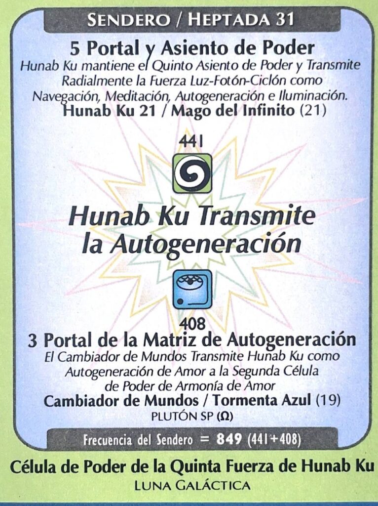 A Frequência das Sendas, V. 11, H. 11. UMB 441. 9ª Estação da Arca: Noé, Pacal (e Valum) Votan—arquetipo dos mensageiros do tempo e do sistema do Cubo. Canal 11º dimensional a partir do qual se originam a totalidade dos padrões do sistema de pensamento e vida Galáctica do cubo. A partir daqui para o corpo calloso flui o hiperplasma concentrado radialmente Sirio B-52/Elemento 113. Hunab Ku 21: Mago do Infinito. Matriz central do canal do universo, a luz-fotón-ciclón do poder de quinta força. Assento da Unidade da totalidade. A partir do portal de Hunab Ku 21 é gerado o hiperplasma Sirio B-52/Elemento 113 que estimula os estados de consciência e percepção radial e ativa as forças centrípeta e centrífuga como as energias cósmicas primarias. 11ª Porta de Unidade: Omnidirecionalidade.