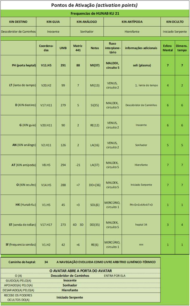 AT (KIN antípoda), V. 8, H. 5. UMB 294. (-21) Vigésima-Primeira magnitude do fluxo do espaço externo sublima o hiperplasma Alfa-Alfa da Criação Cósmica (na 1ª dimensão do tempo exterior). Campo de força do samadhi profundo (1D) sublimado pelo campo de força (7D) do Perceptor Holomental radializado radiosonicamente: Comando Cósmico Descendente. Corresponde ao Hierofante (Enlaçador de Mundos): Primeira Fonte de Poder de Hunab Ku 21 na Corte do Avatar (UMB 291). Ativado pela carga térmica ascendente Dum Kuali (UMB 405) “calor primario”. A morte é a fonte do conhecimento. Marte Galáctico-Kármico.