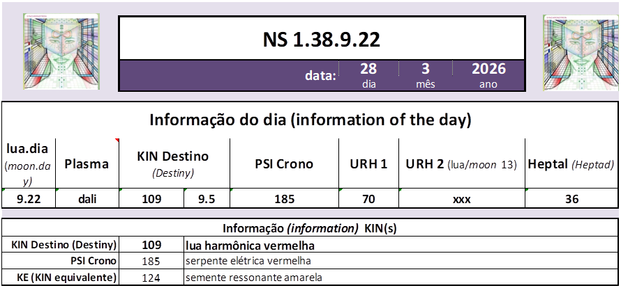 Hoje é NS 1.38.9.22, KIN 109, lua harmônica vermelha, 5. KIN da onda encantada do(a) serpente magnética vermelha, 9. onda do Tzolkin, 1. onda do castelo azul, castelo 3 do Tzolkin.