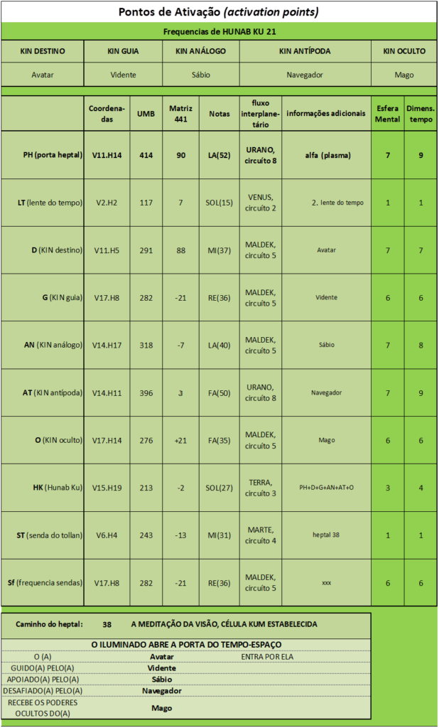 O (KIN oculto), V. 17, H. 14. UMB 276. (+21) Vigésima-Primeira magnitude do fluxo do espaço externo. Ativa o hiperplasma Beta-Beta do Cubo Cósmico (na 4ª dimensão do tempo exterior). Campo de força da mediunidade do consciente desperto (4D). Ativado pelo campo de força lumínico Duar azul do consciente subliminar (6D). Corresponde ao Mago: Quarta Porta de Poder de Hunab Ku 21 na Corte do Descobridor (UMB 279). Ativado pela linha de força lumínico/térmica Kemio “luz do calor interior” (UMB 393). A atemporalidade é o inicio da inteligência. Maldek Solar-Profético.