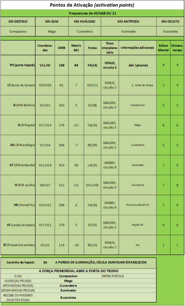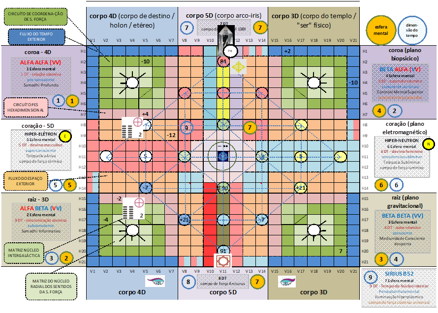 ST (senda do tollan), V. 17, H. 11. UMB 279. (5) Quinta magnitude do campo hipergravitacional organizador do campo de força lumínico Duar azul neutraliza a 6ª esfera mental: consciente subliminar/atrator do universo paralelo. Núcleo energizante central (H.11 eixo equatorial). Quinta porta de Unidade do tempo radial esquerdo. Corresponde ao Descobridor (Guerrero): Quarto Assento de Poder de Hunab Ku 21 (força centrípeta interna): Corte da Inteligência Cósmica. A Inteligência Cósmica cria a célula de luz galáctica. A inteligência é a força centrípeta da totalidade cósmica: Inteligência é luz. Saturno Solar-Profético. Sf (frequencia sendas), V.5, H.2. UMB 114. (-10) Décima magnitude do circuito coordenador superconsciente de quinta força do canal Alfa-Alfa. Sublimar e transferir os sinais internos do tempo 5D da manifestação planetária ao núcleo radial dos sentidos da Criação Cósmica.