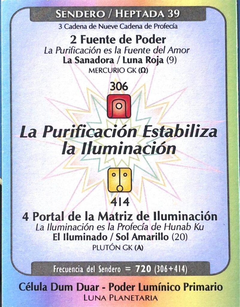 O Kin Oculto, V.5, H.14. UMB 306. (-7) Sétima magnitude do fluxo do espaço externo sublima o hiperplasma Alfa-Beta da Sincronização Cósmica (na 3ª dimensão do tempo exterior). Campo de força do samadhi informativo (3D) sublimado pelo campo de força térmico Kuali vermelho da paranormalidade superconsciente (5D). Corresponde a Curadora (UMB 306 Lua): segunda Fonte de Poder de Hunab Ku 21 na Corte do Compasivo (UMB 303 Cachorro). Ativado pela carga elétrica lumínica Dum Duar “luz primaria” (UMB 411). A Curadora é a fonte do amor. Mercurio Galáctico-Kármico.