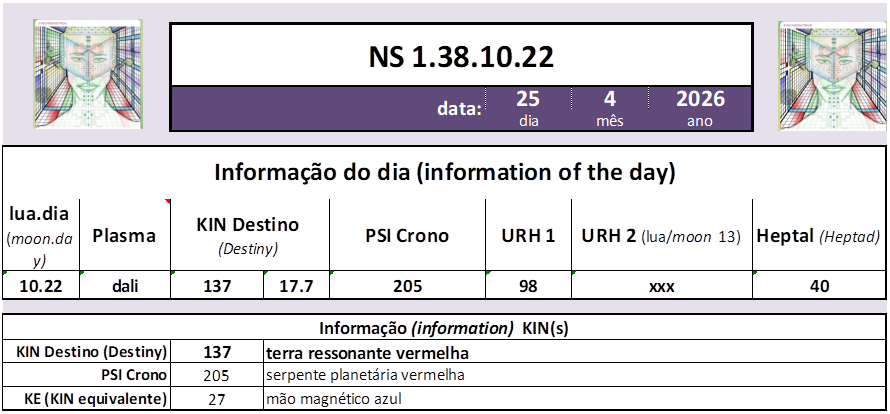 Hoje é NS 1.38.10.22, KIN 137, terra ressonante vermelha, 7. KIN  da onda encantada do(a) macaco, 11. onda do Tzolkin, 3. onda do castelo azul, castelo 3 do Tzolkin.