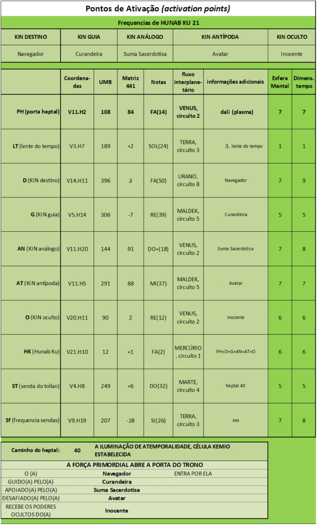 D (KIN destino), V. 14, H. 11. UMB 396. Unidade transformadora. Cataliza o campo de força lumínico Duar azul transformando a luz do calor interior (Kemio) e o calor da luz interior (Kum) dentro do Núcleo do Tempo Interior imprimindo a 7ª esfera mental (Perceptor Holomental) e ativando a sexta esfera mental (consciente subliminar). Oitava porta de Unidade do tempo radial esquerda. Corresponde ao Navegador (Terra): Primeira Porta da Matriz de Hunab Ku 21(linha de força lumínica centrípeta). Une Hunab Ku com a Corte da Inteligência. A navegação é a realização da Consciência Cósmica da inteligência. A partir daqui é gerada a linha de força lumínica que estimula os estados subliminares da consciência da mente e ativam a ordem harmônica do campo de força centrípeta da inteligência. O portal do Navegador mede o campo de força de Hunab Ku para ascender às cargas elétricas de Kum e Kemio. Urano Solar-Profético.